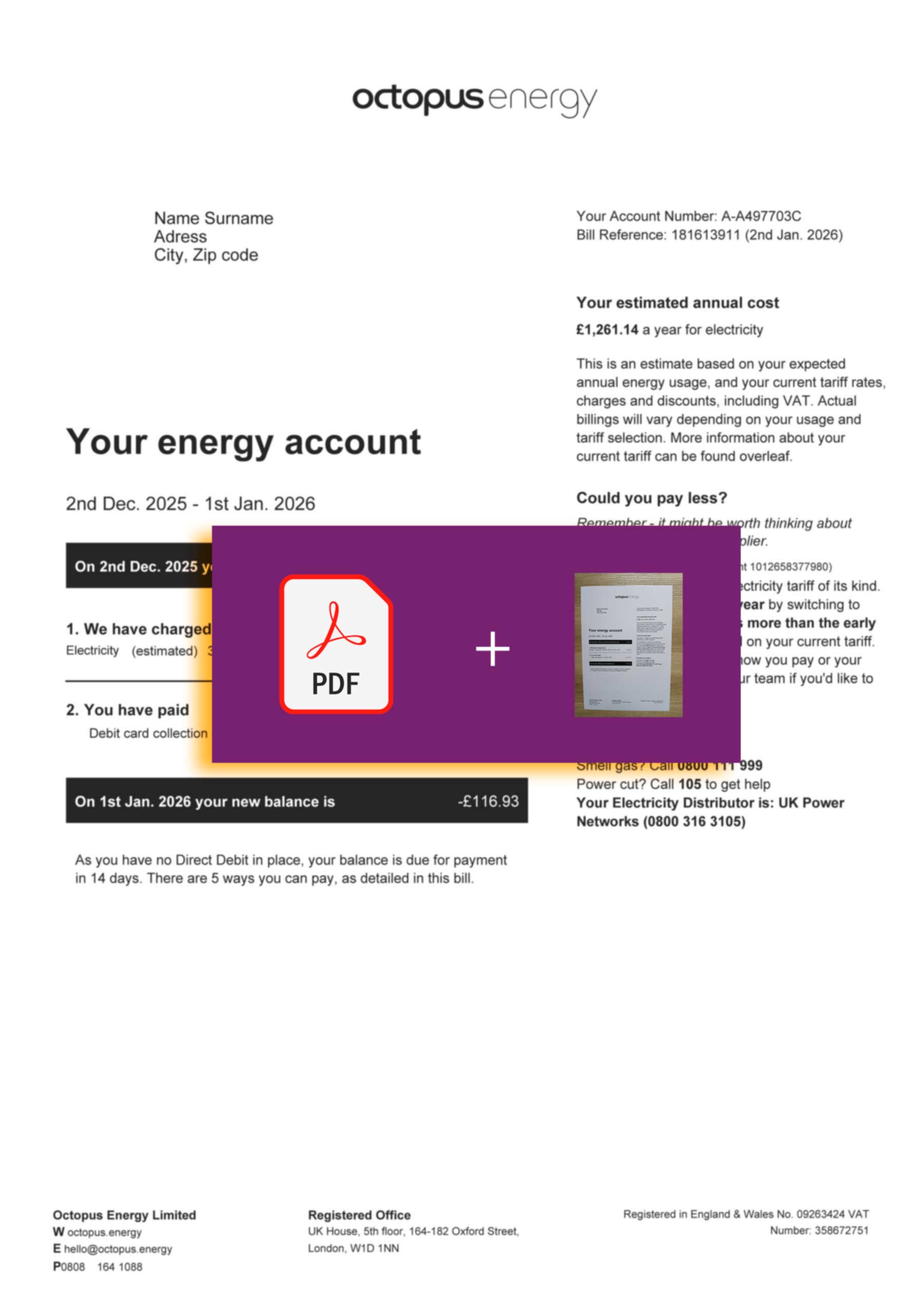 The download includes JPEG or PDF + JPEG formats, each built in 300 DPI for professional-grade output. The file follows the official Octopus Energy layout and includes editable fields for customer name, address, billing cycle, energy consumption, and total amount. Orders include free revisions until approval, delivery within 24 hours, secure checkout, and 24/7 support for full reliability and convenience.