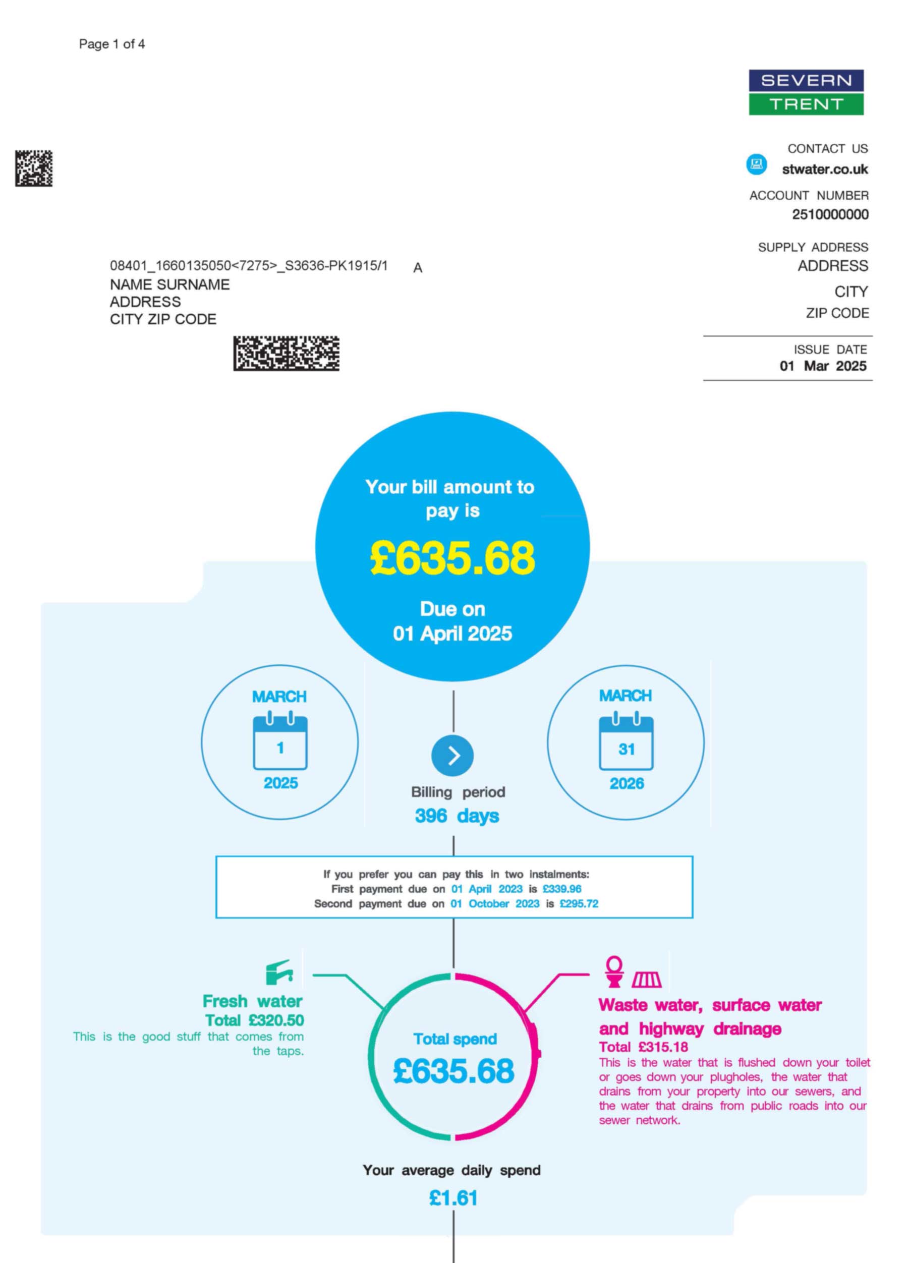 This Severn Trent Water bill template is intended solely for lawful applications such as POA/KYC workflow testing, compliance demos, or UX visualization. Use ethically and responsibly, following all applicable regulations.