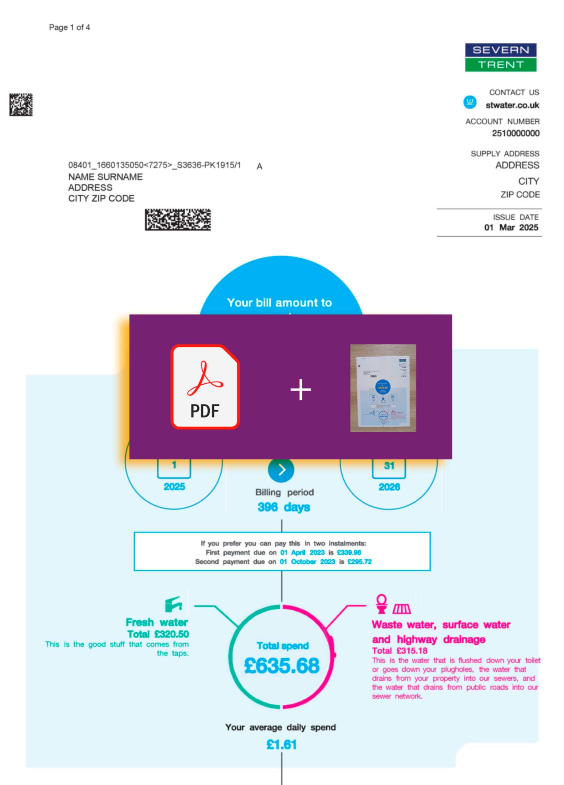 Your download includes both JPEG and PDF + JPEG formats, ready for digital or print use. The file mirrors the genuine Severn Trent Water format for the UK, complete with editable sections such as customer name, supply address, billing totals, and statement period. Every order includes free revisions until approved, secure payment processing, and a guaranteed 24-hour turnaround. All templates are built at 300 DPI to ensure top visual quality and professional accuracy.