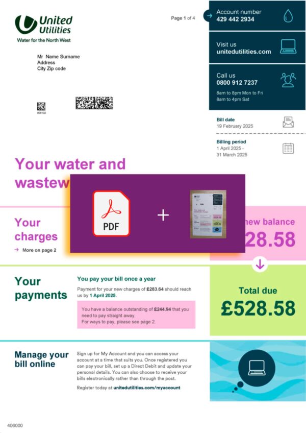 Your completed United Utilities water bill arrives as a JPEG or PDF+JPEG file, ready for digital upload or print submission.