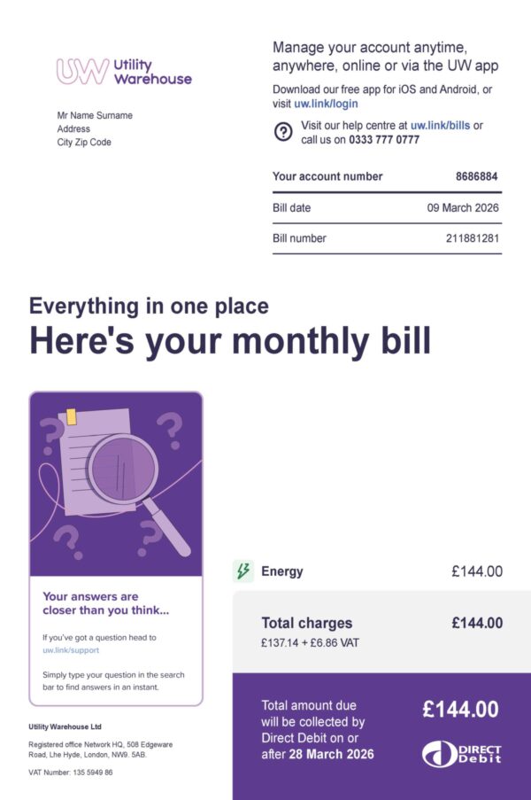 This Utility Warehouse telecom statement template is designed for lawful usage, including internal documentation, UI/UX testing, proof-of-address demonstrations, or system verification processes. Always apply within ethical and compliant boundaries.