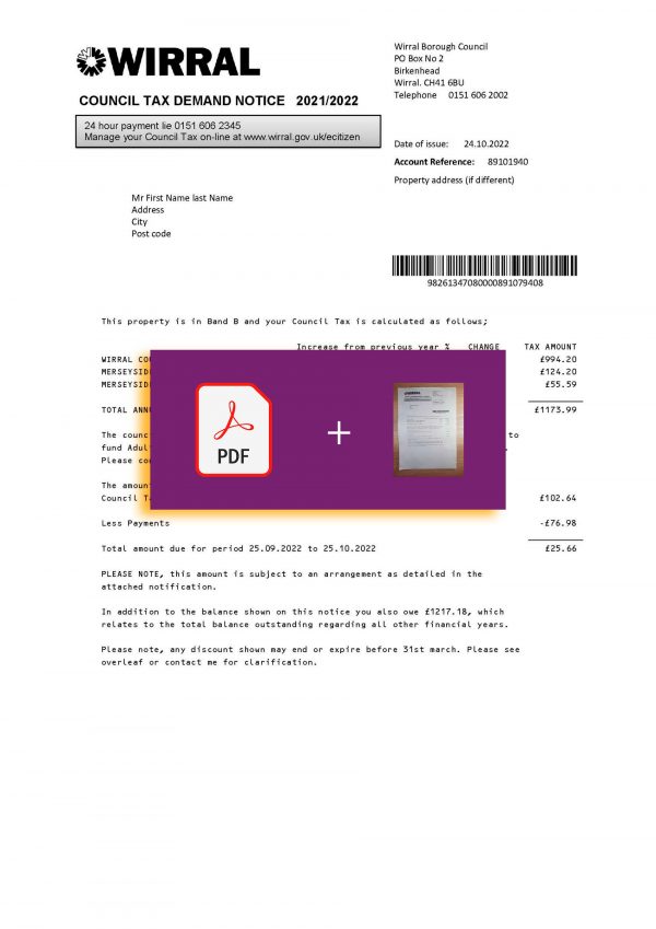 This package contains high-resolution JPEG or PDF + JPEG versions in 300 DPI, fully aligned with the authentic Wirral Council design. Editable sections include taxpayer name, address, billing date, reference number, and payment totals. Every order includes free revisions until approved, secure checkout, and 24/7 customer support for a smooth and reliable experience.