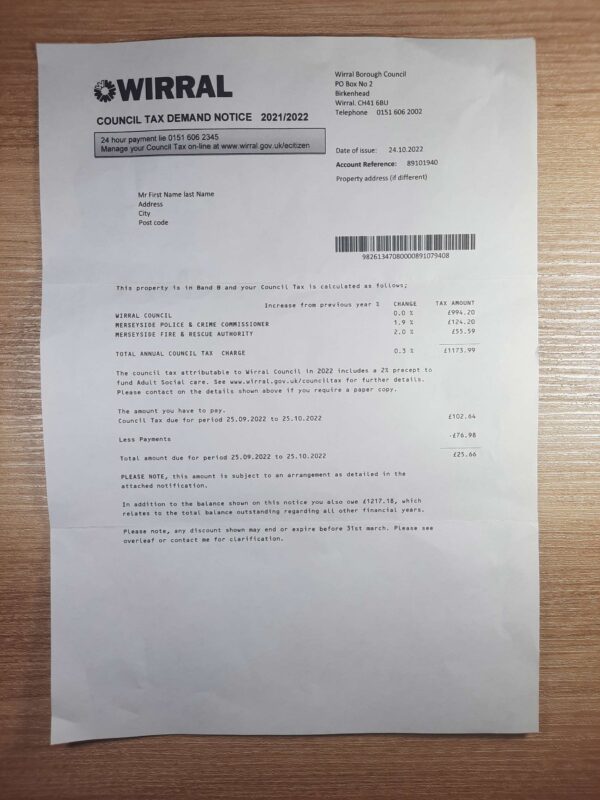 This Wirral Council Tax example complements utility templates like the Thames Water bill and the British Gas format, both crafted to match authentic layouts for address validation and UX testing.