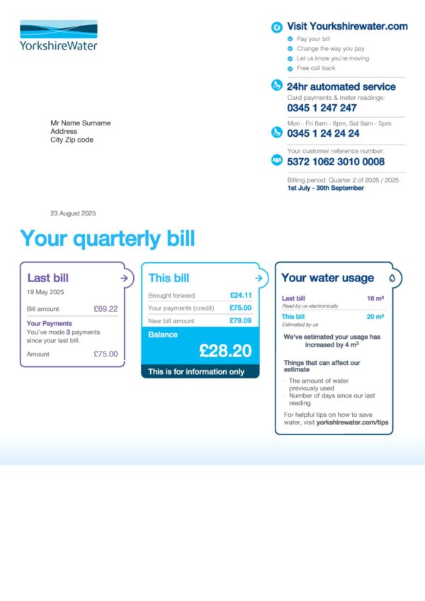 This editable Yorkshire Water utility bill template – realistic UK water statement – replicates the authentic layout used across the United Kingdom for customer billing. Delivered in high-resolution 300 DPI, it’s ideal for professionals conducting UX/UI interface simulations, KYC or proof-of-address documentation, and visual testing workflows. The file includes editable fields such as customer details, address, billing cycle, water usage, and total charges — all managed through a Done-For-You process that ensures precision and simplicity.