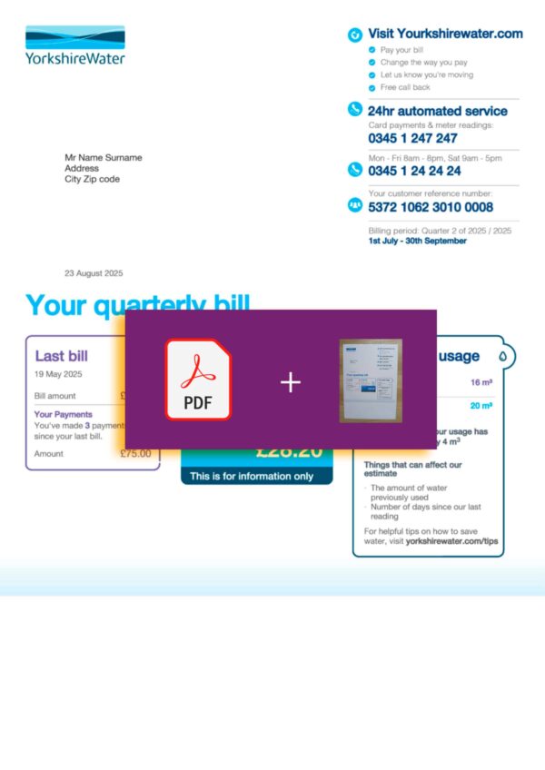 Your completed Yorkshire Water bill arrives as a JPEG or PDF+JPEG file, ready for digital upload or print submission.