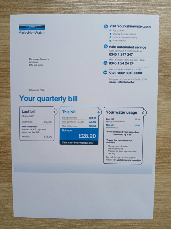 Moving into a home in Yorkshire means your water account transfers automatically — but a Yorkshire Water bill showing your name and new address takes time to materialise when you need it for proof of address today. Submit your details through the secure form and the team will prepare your document, delivering the finished JPEG file straight to your inbox. Turnaround is same-day in most cases, never exceeding 24 hours.