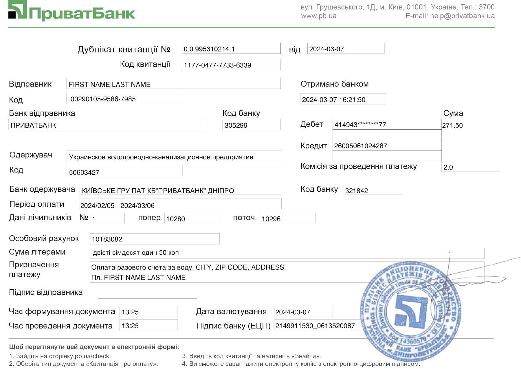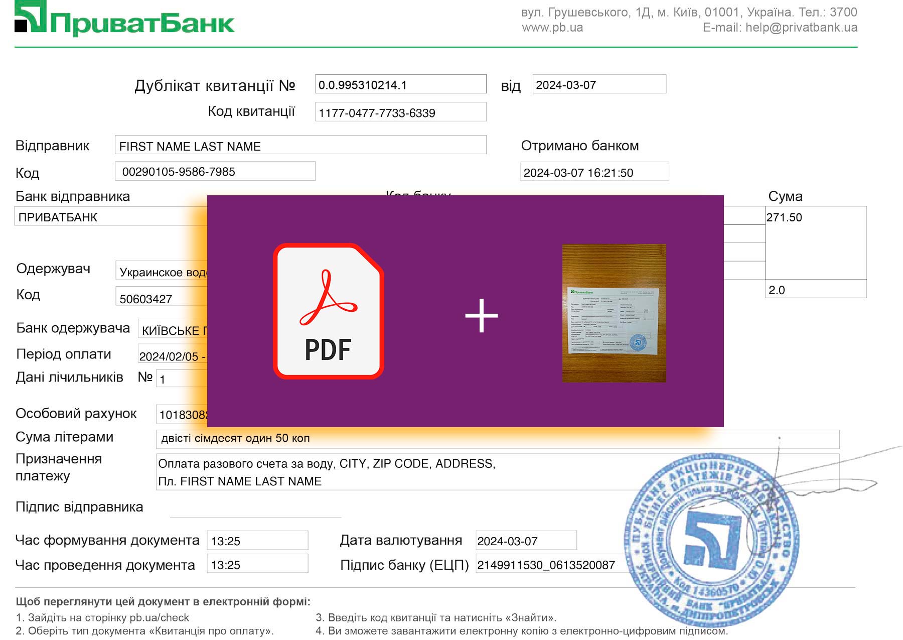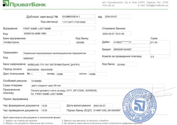 Each order includes both PDF and JPEG formats in crisp 300-DPI quality. The layout follows authentic Ukrainian utility standards with editable sections for customer name, address, billing cycle, and totals. You’ll also receive free revisions until approval, secure checkout, and 24-hour turnaround supported by our 24/7 assistance team.