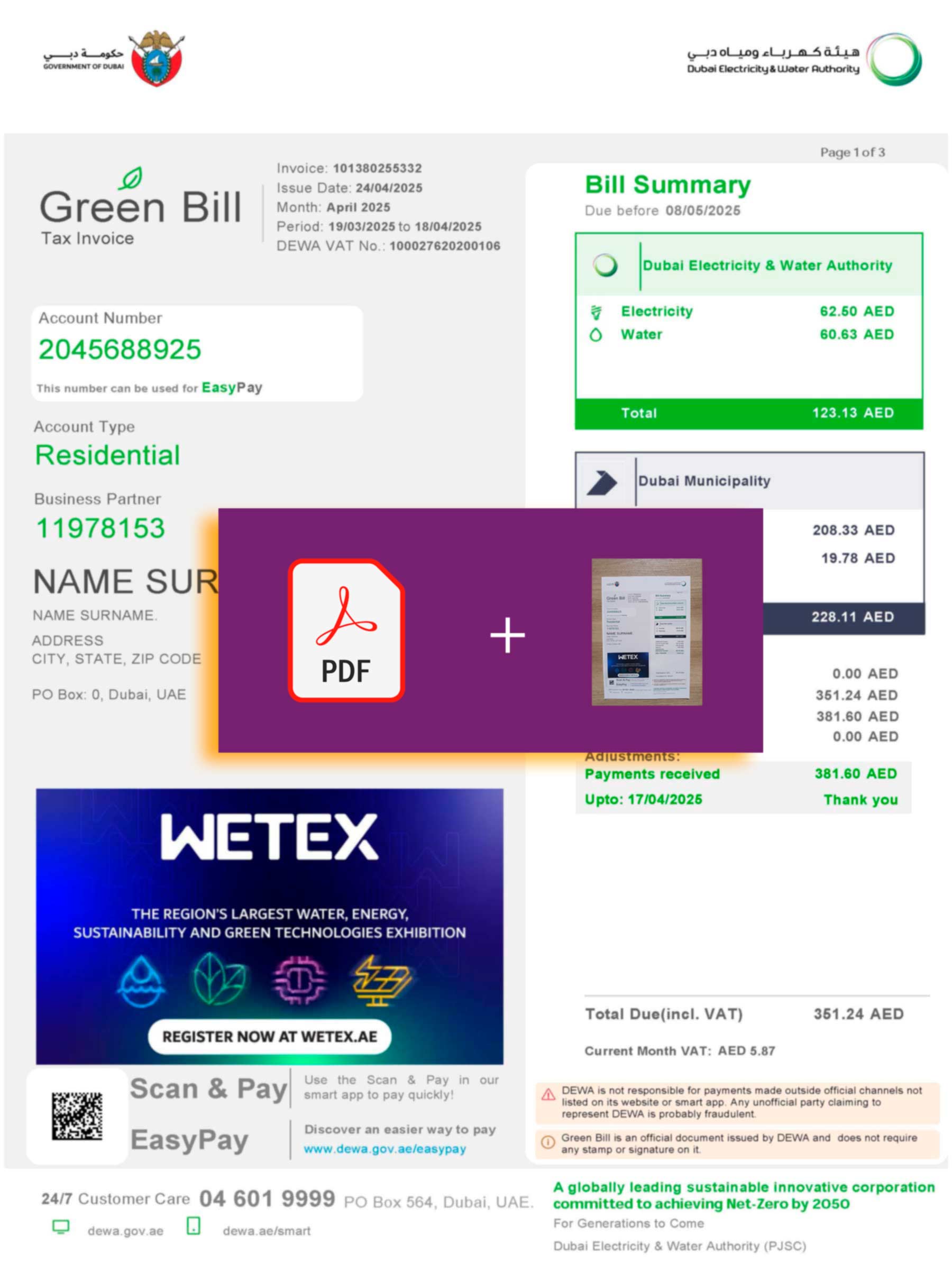 Your download includes both JPEG and PDF files, each fully editable and aligned with standard UAE energy provider layouts. Editable areas include customer name, service address, account ID, billing cycle, and total due. The package includes free revisions until approved, 24-hour turnaround, secure checkout, and continuous 24/7 customer support for guidance or updates.