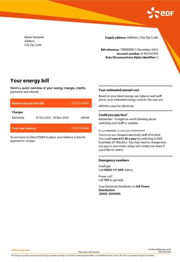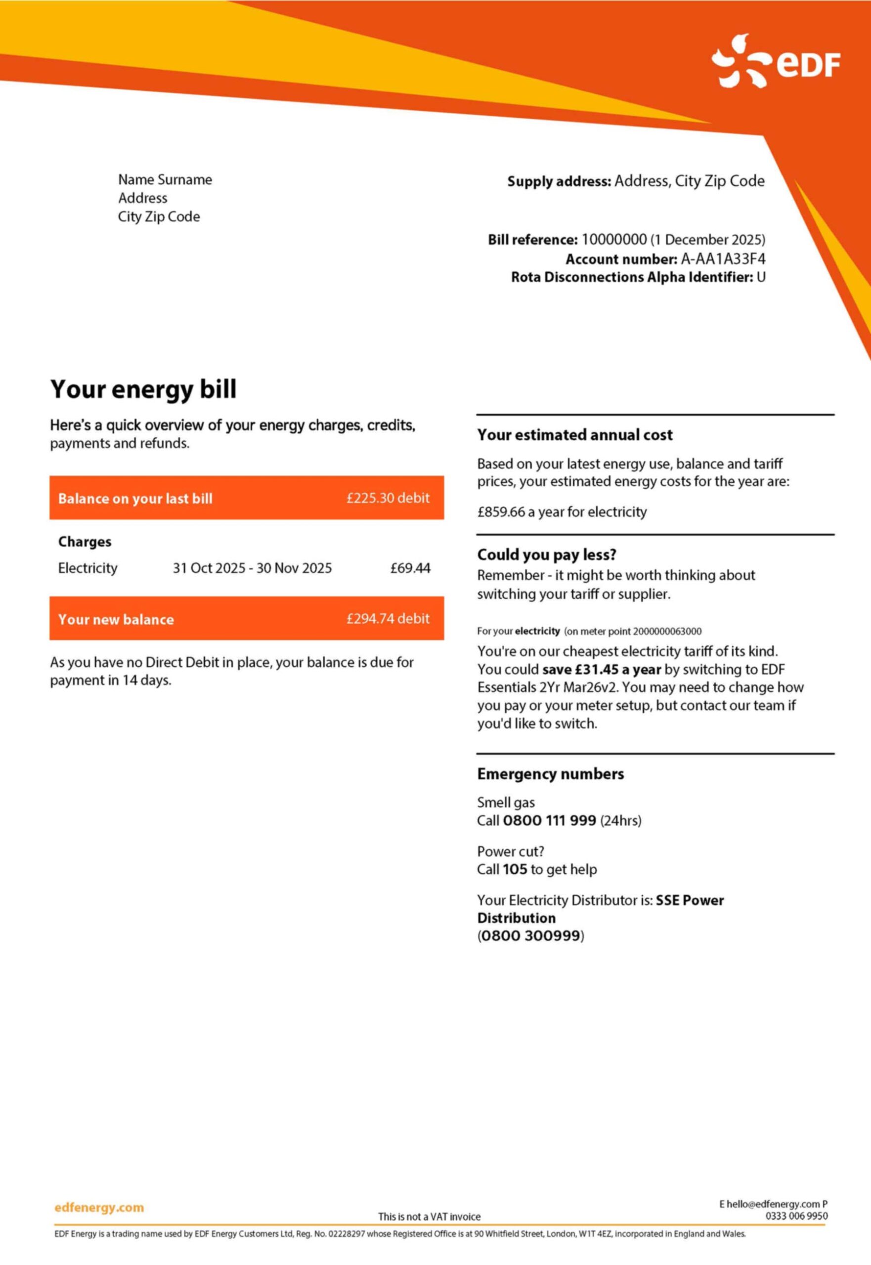 The EDF Electricity layout is a great companion to the SSE Energy bill and the E.ON Electricity version, providing a clean, editable, and highly realistic UX experience.