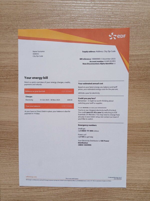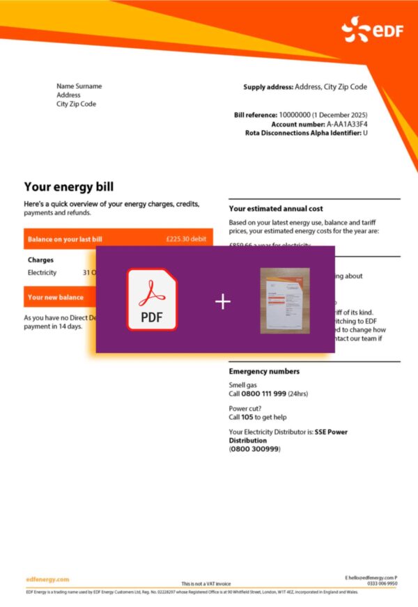 Your download includes PDF and JPEG formats in full 300-DPI clarity, with editable zones for name, address, billing period, and total charges. The layout follows EDF’s authentic UK billing design. Every order includes free revisions until approval, secure online checkout, a 24-hour turnaround, and 24/7 email support for a smooth and reliable process.