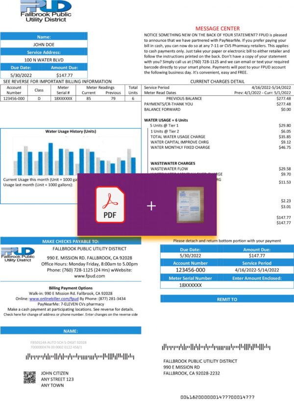 The California FPUD Water Bill Template – 2025 Editable Format offers a high-resolution, Done-For-You digital file replicating the standard layout of a Fallbrook Public Utility District (FPUD) statement. Delivered in 300 DPI quality, it’s ideal for professionals working with proof-of-address (POA), KYC documentation, UI/UX testing, or design mockups. The editable template maintains realistic billing cycles, customer data sections, and amount summaries, ensuring usability for visual presentations and compliance-related simulations.