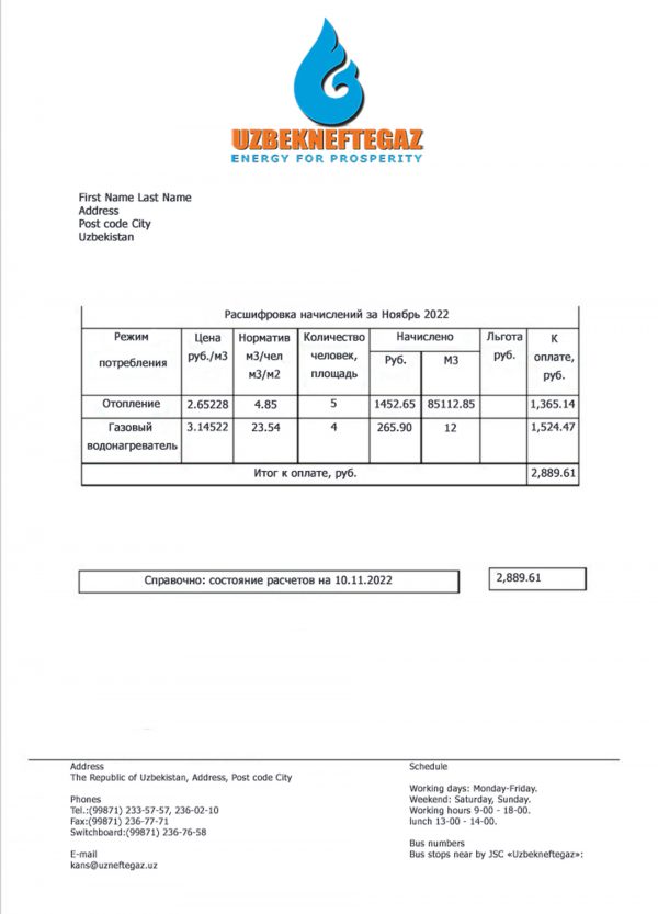 You’ll receive editable PDF and JPEG files at 300 DPI, featuring the official-style Uzbekistan gas layout. Editable areas include customer name, service address, account number, billing cycle, and amount due. This package provides a secure checkout process, delivery within 24 hours, free revisions until approval, and 24/7 customer support for full convenience and accuracy.