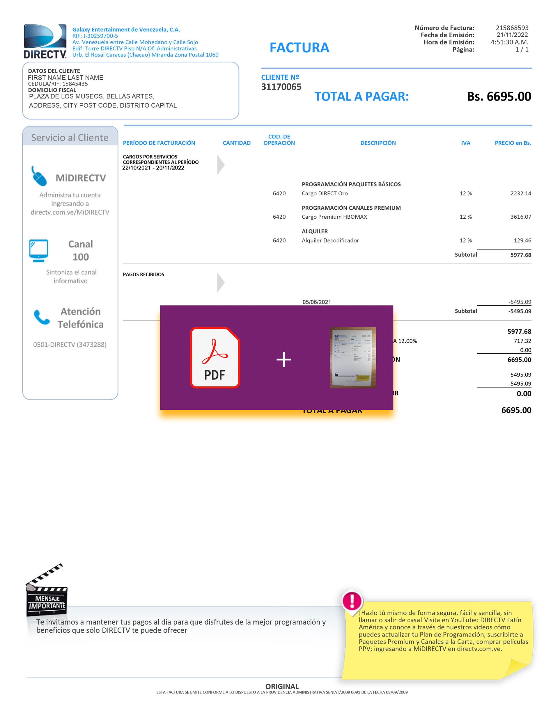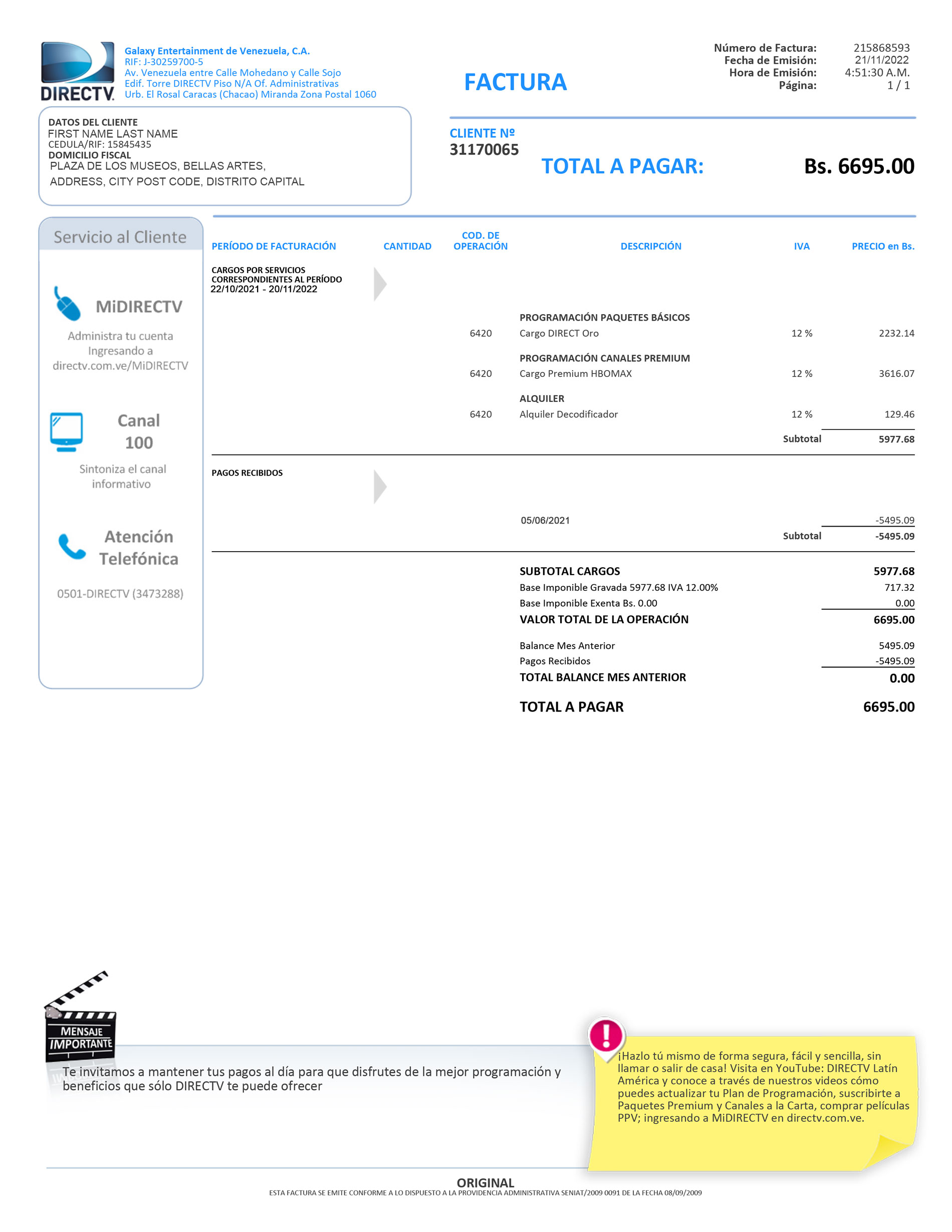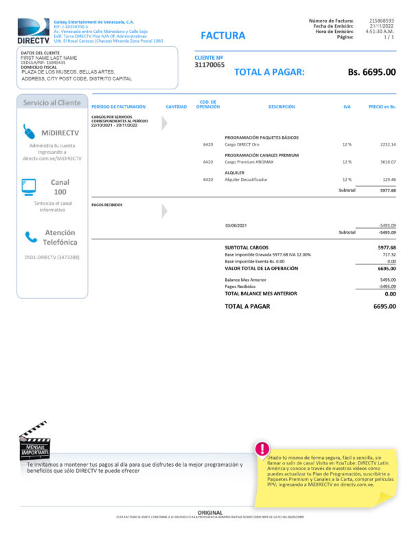 Editable fields include subscriber name, service address, billing date, data/voice usage, and payment totals. The layout preserves the authentic Venezuelan telecom design and is compatible with standard PDF editors or Adobe Photoshop while retaining 300 DPI print quality.