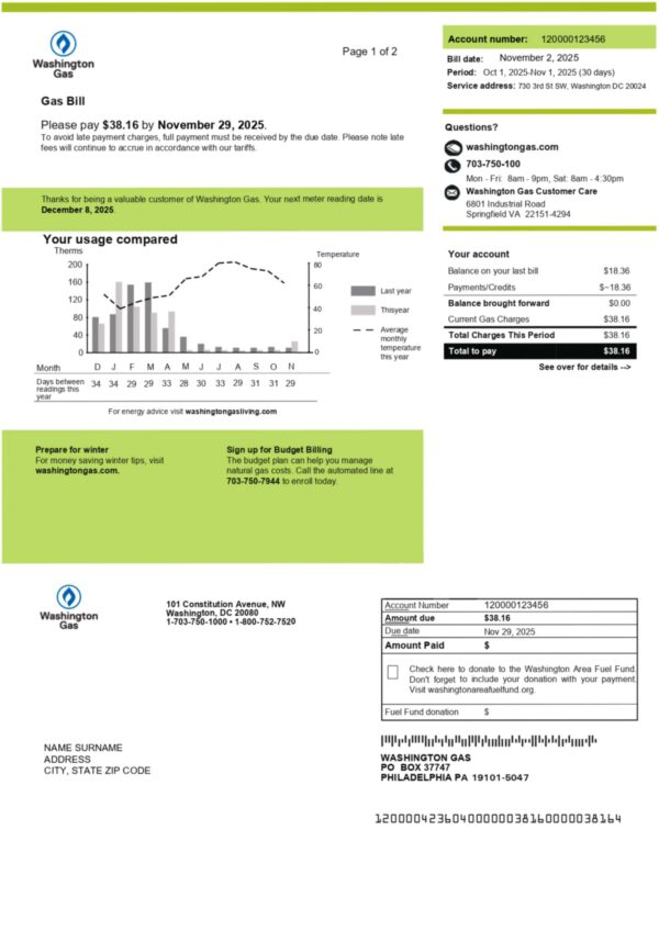 We can adjust customer name, service address, billing period, usage lines, charges, and totals while preserving the Washington Gas layout. Files work with common PDF editors and Photoshop if you ever need light annotations.