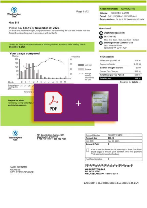 We can adjust customer name, service address, billing period, usage lines, charges, and totals while preserving the Washington Gas layout. Files work with common PDF editors and Photoshop if you ever need light annotations.
